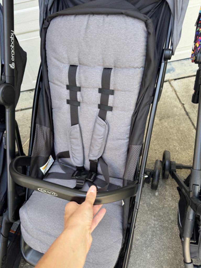 Speaking of the bar, it has to be pulled out completely to remove it, because there’s no option to just open it up on one side for the child to get in and out.